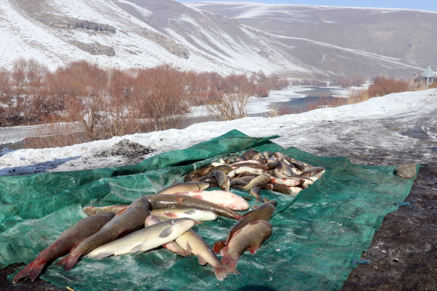 Dondurucu soğuklarda ve zorlu bir mücadelenin ardından çuvallara doldurulan balıklar Ağrı-Van kara yolunun kenarında satılmaya çalışılıyor.