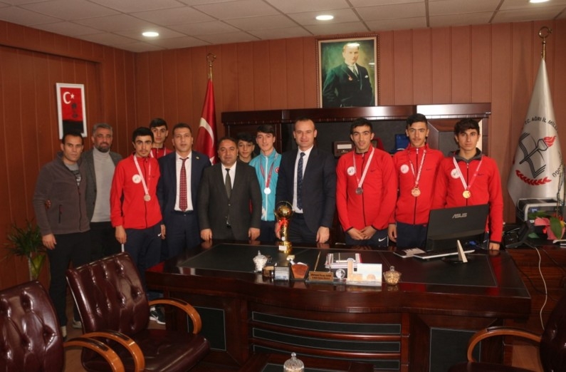 Milli Eğitim Şube Müdürü Kutbeddin Kaya, Spor Lisesi okul yöneticileri, öğretmenleri Antalya’da düzenlenen Türkiye Okul Sporları Kros dalında Türkiye takım üçüncüsü olan öğrencileri ile Türkiye Bireysel Kros Yarışmasında ikincilik elde eden Spor Lisesi öğrencisi Ali Demir, İl Milli Eğitim Müdürü Mehmet Faruk Tekin’i ziyaret ettiler. Başarılı öğlencileri tebrik eden Tekin, Ağrı’nın okul sporlarında gerek katılım gerekse başarı yönünden Türkiye ortalamasının üstünde ve iyi bir yerde olduğunu;daha da iyi olmak için çalışacaklarını ifade ederek,”“Okulun alt yapısını en uygun hale getirmek için çalışıyoruz. Sizler yeter ki başarılı olun. Biz bütün imkânlarımızı seferber ederek sizlerin yanınızda olacağız. Çeşitli dallarda bütün çalışmalarınızı rahatlıkla yapacağınız tesisler oluşturmak için elimizde geleni yapmaya çalışacağız. Gençler, sizlerden başarı, bizden de destek bekleniyor ve bunu da yapacağız. Ağrı Spor Lisemiz Türkiye’de kendi alanında marka bir okul olacaktır. Hepinizi tekrar tebrik ediyor, gözlerinizden öpüyor; başarılarınızın devanı diliyorum. Sizlerle gurur duyuyoruz” dedi. Öğrencilerle bir süre sohbet eden Tekin, okul yöneticilerinden spor dalında yapılan çalışmalar hakkında bilgi aldı. Okul Müdürü Murat Demir, öğretmenlerle birlikte yaptıkları projeleri anlattı. Şube Müdürü Kutbeddin Kaya tarafından il geneli okul sporları ile ilgili bilgilendirme yapıldı.