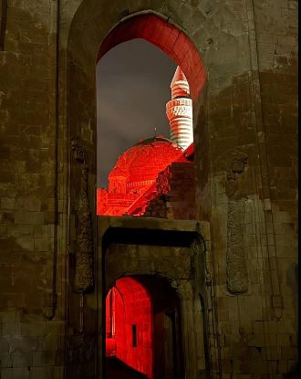 İshak Paşa Sarayı’nda gerçekleştirilen kırmızı ışıklandırma, 14 Mart Tıp Bayramı dolayısıyla sağlık çalışanlarına ithaf edildi.