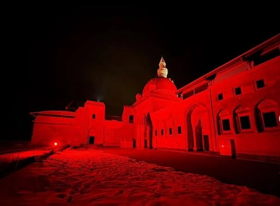 14 Mart Tıp Bayramı kapsamında İshak Paşa Sarayı kırmızı ışıkla aydınlatıldı