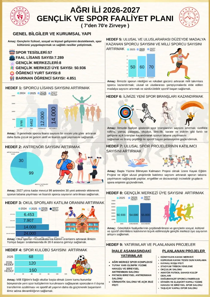 Gençlik ve Spor Bakanlığı 2024-2028 Stratejik Planı doğrultusunda; Valiliğimiz himaye ve koordinesinde, Gençlik ve Spor İl Müdürlüğümüz başta olmak üzere ilgili kamu kurum ve kuruluşları, yerel yönetimler, federasyon temsilcilikleri, spor kulüpleri ve sivil toplum kuruluşlarının katkılarıyla hazırlanan “Ağrı İli Gençlik ve Spor Faaliyet Planı” yürürlüğe girmiştir.
