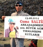 Kendisinin 500’üncü zirvesini yaptığını, bunun da doğum gününe denk gelmesinin heyecanını yaşadığını anlatan Saltik, arkadaşlarının sürpriz yaparak pankart açtığını söyledi.