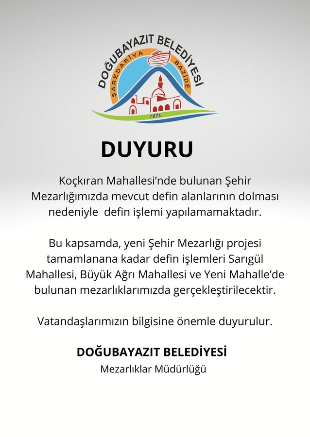 Doğubayazıt Belediyesi Şehir Mezarlığında mevcut defin alanlarının dolması nedeniyle yeni mezarlık alanlarının açılması için çalışma başlattı. Belediye Mezarlıklar Müdürlüğünden yapılan açıklamada Şehir Mezarlığının dolu olması nedeniyle defin işlemlerinin yapılamadığı, yeni şehir mezarlığı projelerinin uygulamaya konulmasına kadar defin işlemlerinin Sarıgül mahallesi Büyük Ağrı Mahallesi ve Yeni mahallede bulunan mezarlıklarda bulunan mezarlıklarda gerçekleşeceğini açıkladı.