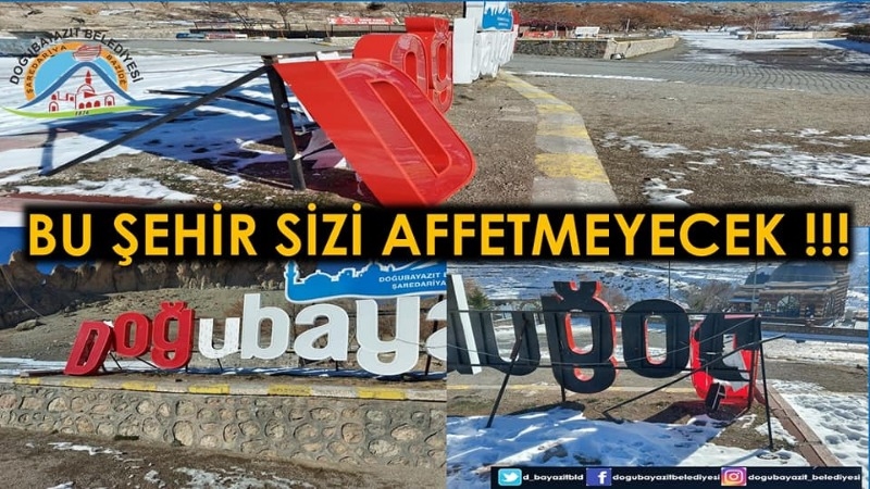 Belediyemizin yoğun ilgi ile adeta turist akınına uğrayan şehrimizin yapısına katkı sağlamak amaçlı yaptığı sosyal ve görsel projeler kapsamında, şehrimizin nişanesi haline gelen Doğubayazıt yazılı ışıklı tabelalar, tekmelenerek kullanılamaz hale geldi.” Denildi.