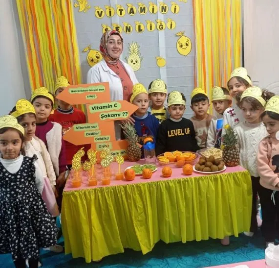 Doğubayazıt Müftülüğü bünyesinde eğitim veren Mevlana Camii 4-6 yaş Kur'an Kursu grubu öğrencileri, kış aylarına enerji dolu bir "merhaba" dedi. Kurs binasında düzenlenen "C Vitamini Şenliği" ile minikler hem eğlendi hem de sağlıklı beslenmenin manevi boyutunu öğrendi. Etkinlik kapsamında minik öğrenciler, meyvelerin renkli dünyasında keyifli bir yolculuğa çıktı. Kur'an Kursu Öğreticisi Damla Can'ın eşliğinde meyvelerin faydalarını öğrenen çocuklar, kendi elleriyle hazırladıkları kağıttan "Vitamin Taçları" ile günü renklendirdi. Portakal, mandalina ve limonların suyunu kendi elleriyle sıkan miniklerin heyecanı gözlerinden okundu.