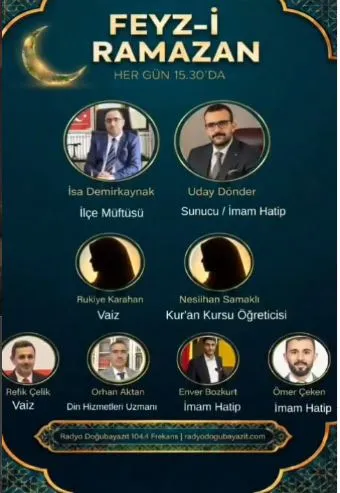 Doğubayazıt Müftülüğü programla ilgili: "Ramazan’ın bereketini, huzurunu ve o eşsiz maneviyatını radyo Doğubayazıt dalgalarıyla evlerinize taşıyoruz. İlçe Müftülüğümüz tarafından hazırlanan 'Feyz-i Ramazan' programı ile iftar neşesini ve sahur bereketini birlikte paylaşıyoruz. Kur’an-ı Kerim tilavetleri, gönüllere şifa olan sohbetler ve dualarla bu kutlu ayın feyzinden hep birlikte istifade edelim. Sesimizin ulaştığı her yere selam, gönüllere muhabbet olsun.