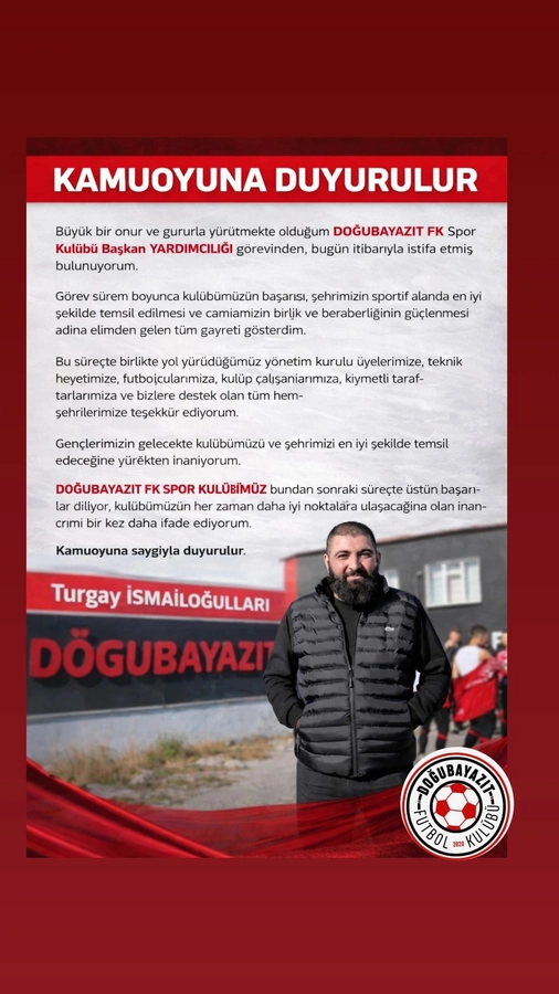 Büyük bir onur ve gururla yürütmekte olduğum DOĞUBAYAZIT FK Spor Kulübü Başkan Yardımcılığı görevinden, bugün itibarıyla istifa etmiş bulunuyorum.