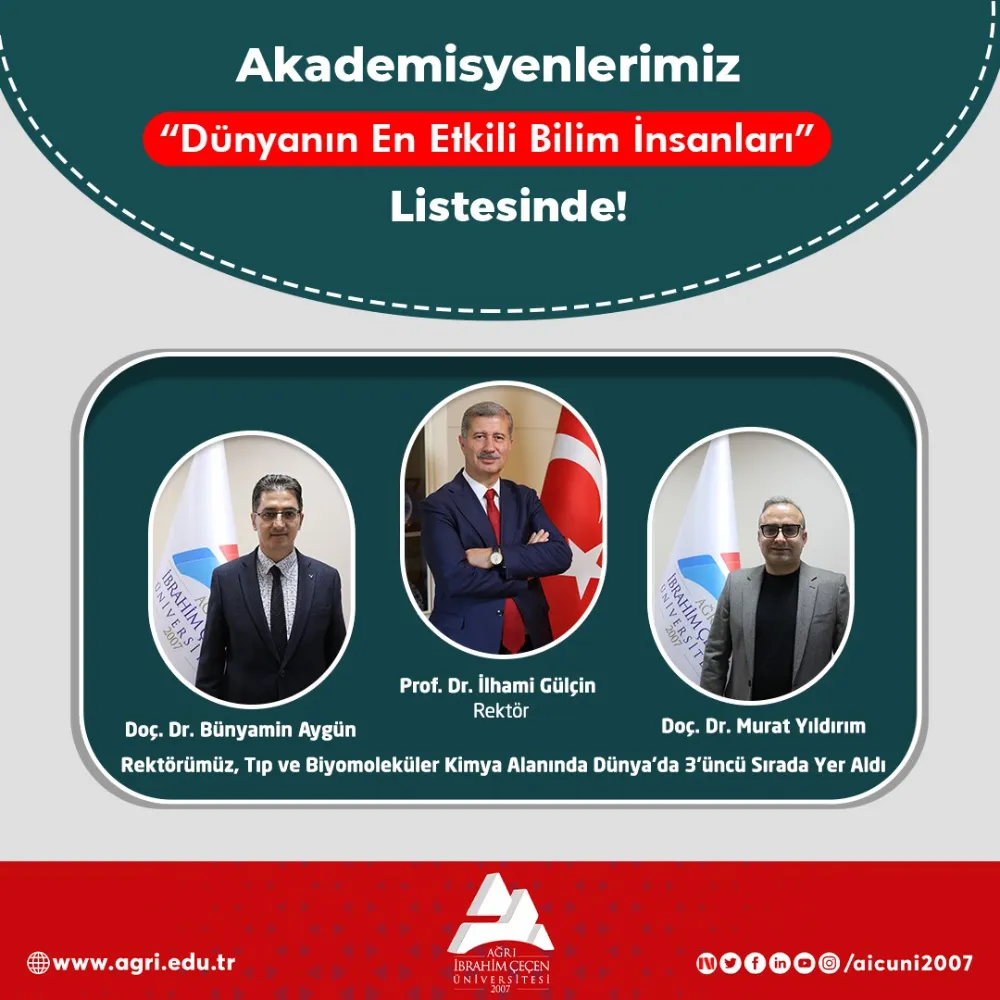 Stanford Üniversitesi ile Hollanda merkezli bilimsel yayın kuruluşu Elsevier iş birliğiyle her yıl yayımlanan “Dünyanın En Etkili Bilim İnsanları” listesi açıklandı. 22 ana bilim dalı ve 174 alt bilim dalı açısından yapılan değerlendirmeye göre bilim dünyasında büyük prestije sahip olan ve yaklaşık 300 bin bilim insanının bulunduğu dünyanın en etkili bilim insanları listesinde Ağrı İbrahim Çeçen Üniversitesi (AİÇÜ) Rektörü Prof. Dr. İlhami Gülçin ile Psikoloji Bölümünden Doç. Dr. Murat Yıldırım ve Mekatronik Bölümünden Doç. Dr. Bünyamin Aygün yer aldı.
