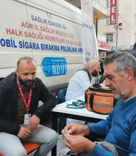 Sağlık Müdürlüğünün “Mobil Sigara Bırakma Poliklinik” Hizmeti Devam Ediyor! Doğubayazıt'ta mobil uygulama ile sigaranın sağlığa zararları anlatılarak ”Sigara bırakma" poliklinik hizmeti devam ediyor. Bu kapsamda örnek bir davranış sergileyerek sigarasını kırarak atan hemşehrimiz için Sağlık Müdürlüğü: