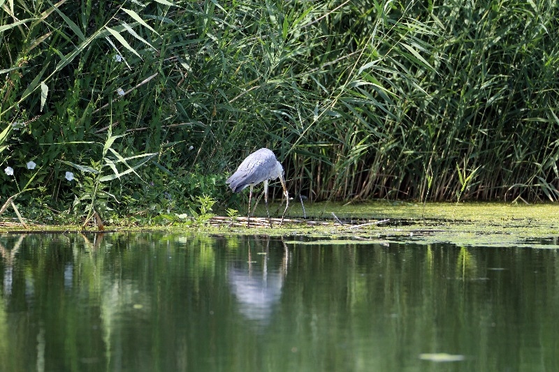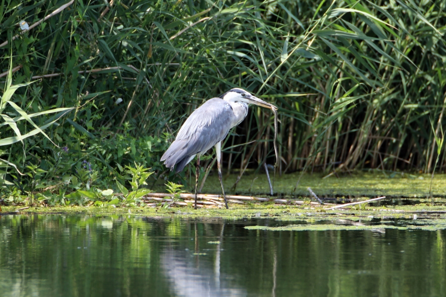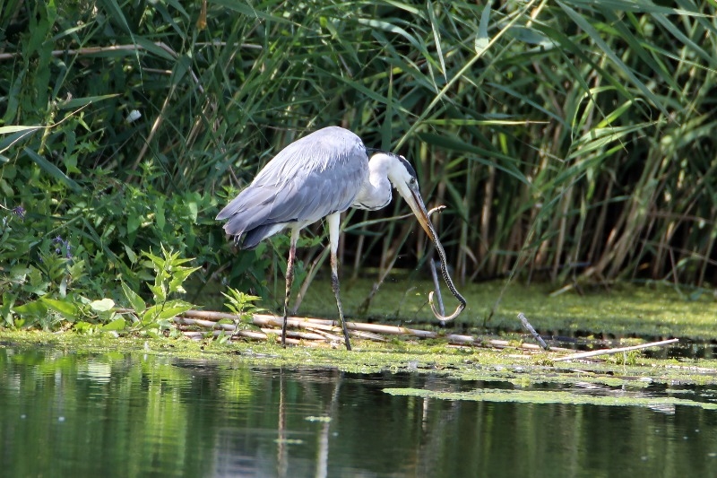 Genellikle balık avıyla beslenen gri balıkçıl, bu kez bulduğu bir yılanla karnını doyurdu.