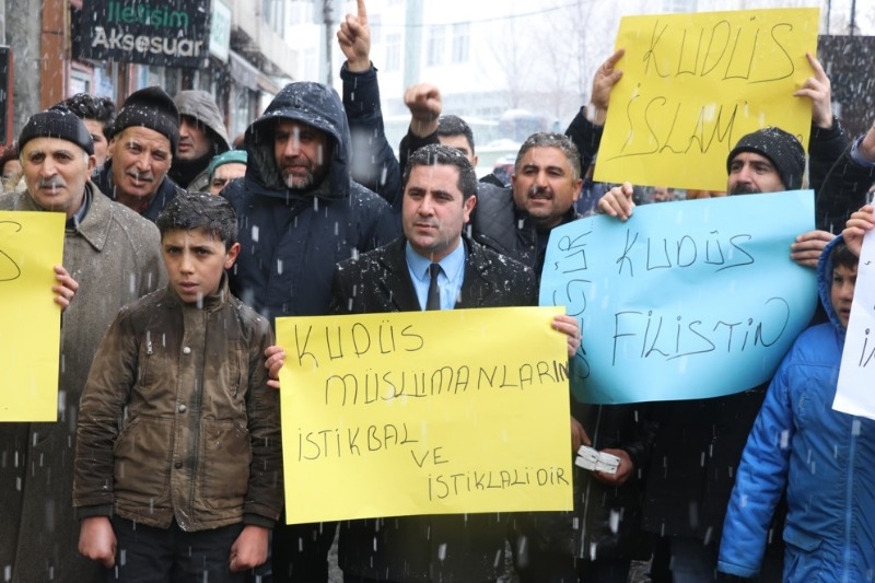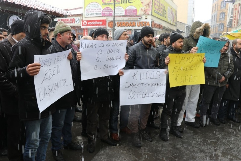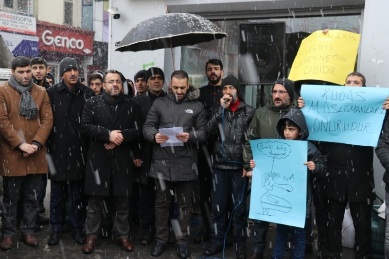 Grup adına konuşma yapan Peygamber Sevdalıları Vakfı Ağrı Şube Başkanı Arif Yılmaz, yüzyılın anlaşması denilen sözde planın, Kudüs’ün bütünüyle işgal edilmesi, Filistinlilerin vatanlarından çıkarılması ve işgalin meşrulaştırılması çabasından ibaret olduğunu söyledi.
