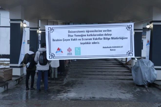 Ağrı İbrahim Çeçen Üniversitesi, İbrahim Çeçen Vakfı ile Kültür ve Turizm Bakanlığı Vakıflar Genel Müdürlüğü iş birliğiyle ramazan ayı boyunca üniversitenin yerleşkesindeki merkezi yemekhanede öğrenciler için iftar yemeği çıkarılıyor.