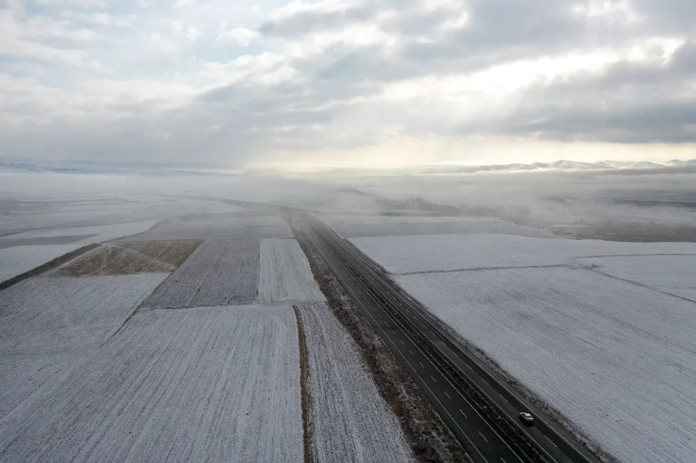 Ağrı'da etkili olan kar yağışı sonrası köyler beyaza büründü, ova sisle kaplandı.