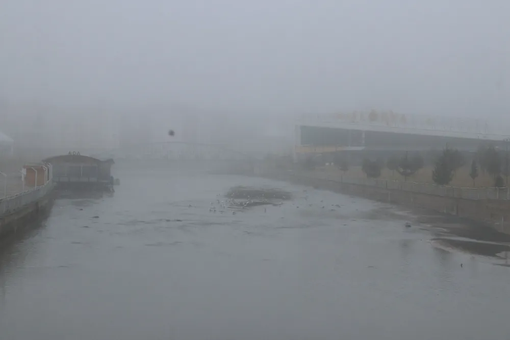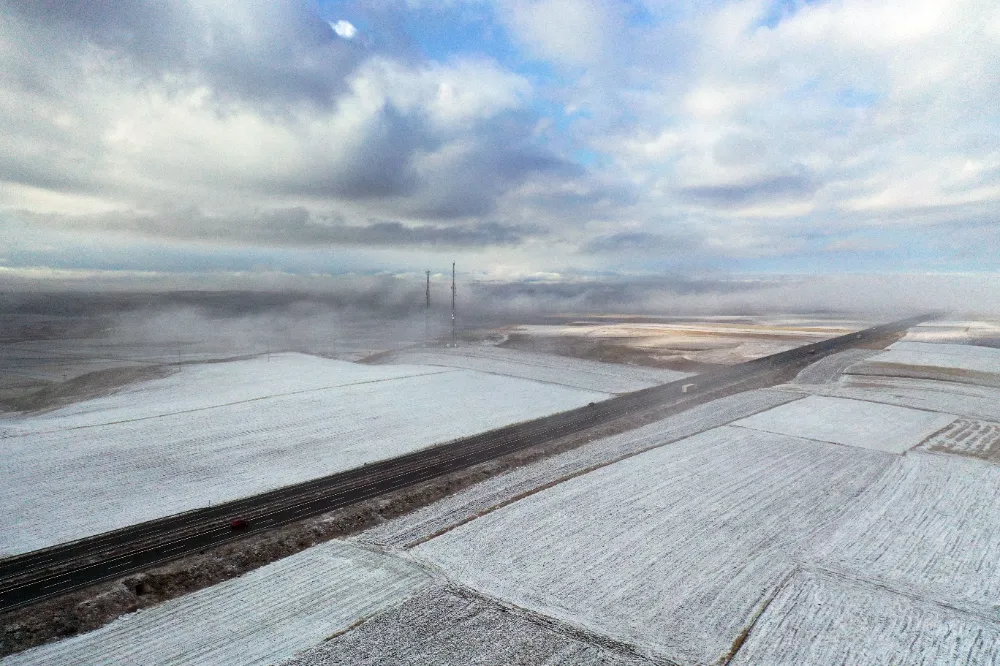 Karla kaplanan araziler ve sis altında kalan bölgeler, dronla görüntülendi.