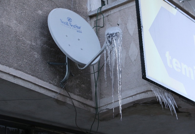 Şehir mezarlığında bulunan su deposunun çevresinde oluşan ve boyu 5 metreyi bulan buz sarkıtları güzel manzara oluşturdu.