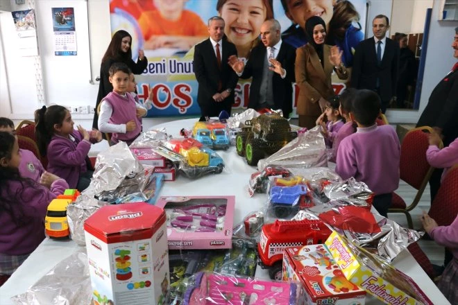 İbrahim Çeçen İlkokulunda düzenlenen programa katılan Vali Mustafa Koç ve eşi Neslihan Gül Koç, öğrencilerle toplanan oyuncakları kolilere yerleştirdi.