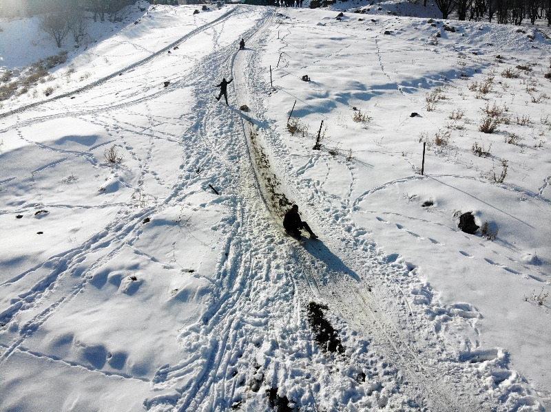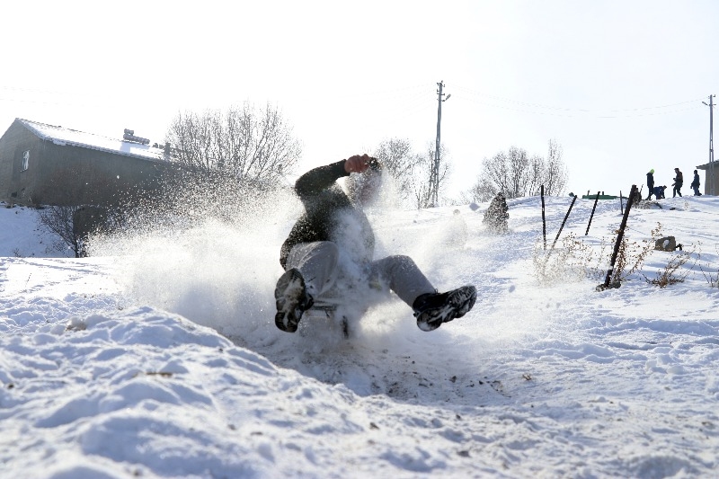 Köydeki çocuklar ve gençler, boş vakitlerinde kızak kayarak keyifli zaman geçiriyor.