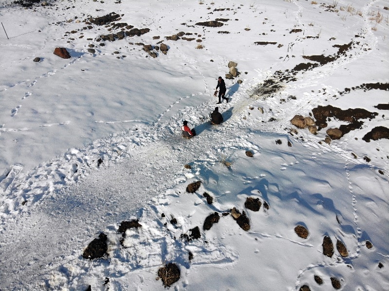 Ağrı'da çocuklar karlı tepelerde kızak kayarak gönüllerince eğleniyor.