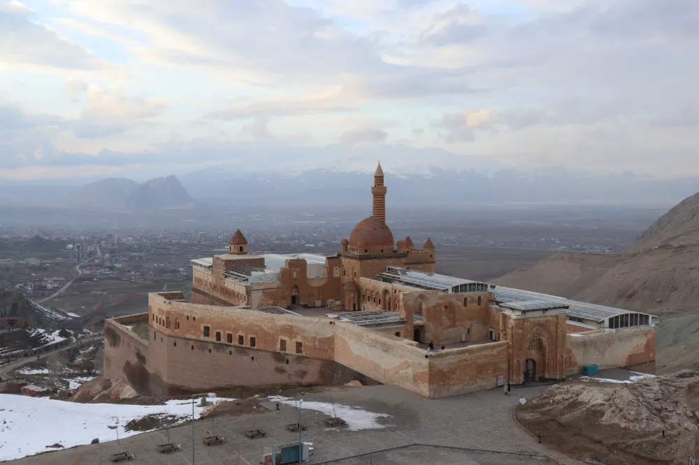 Karla kaplı dağlar ve doğal güzellikleri fotoğraflayan doğa tutkunları, daha sonra Doğubayazıt ilçesinde bulunan UNESCO Dünya Miras Geçici Listesi'nde yer alan tarihi İshak Paşa Sarayı ve çevresinde vakit geçiriyor.
