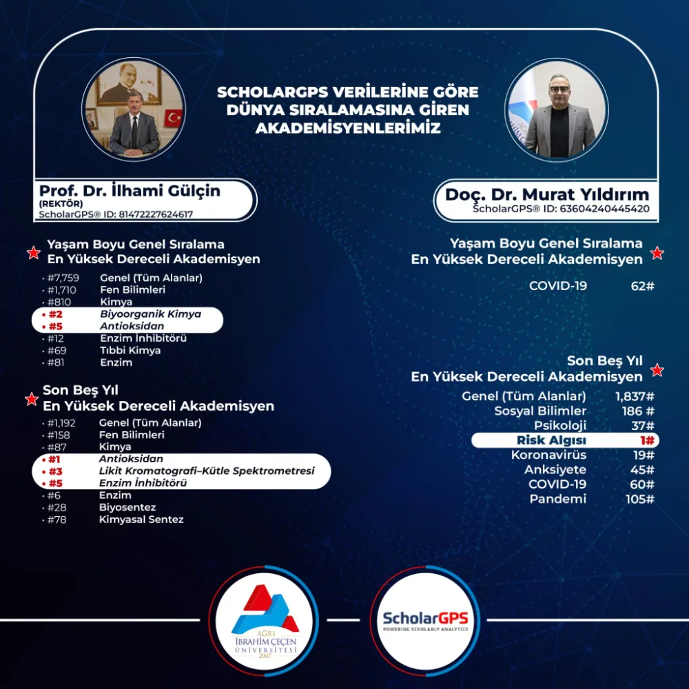 Bilimsel performansıyla dünyanın en etkili akademisyenleri arasında yer alma başarısı gösteren Rektör Prof. Dr. İlhami Gülçin, Yaşam Boyu Genel Sıralama kategorisinde dünyada Biyoorganik Kimya alanında 2’nci, Antioksidan alanında 5’inci sırada yer aldı. Prof. Dr. Gülçin ayrıca, dünyada son 5 yıldaki En Yüksek Dereceli Akademisyen Sıralamasında Antioksidan alanında 1’inci, Likid Kromatografi–Kütle Spektrometresi alanında 3’üncü, Enzim İnhibitörü alanında ise 5’inci olarak büyük bir başarıya imza attı.