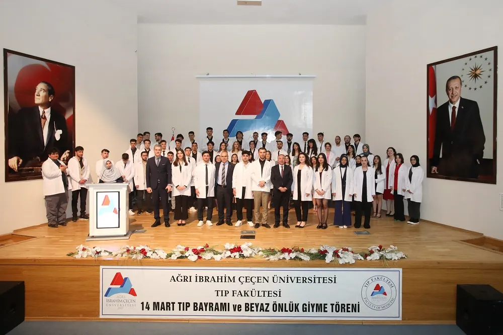 Ağrı İbrahim Çeçen Üniversitesi Tıp Fakültesi tarafından 14 Mart Tıp Bayramı kapsamında kutlama programı düzenlendi. Programda, Tıp Fakültesi birinci sınıfta öğrenim gören 64 öğrenci beyaz önlük giydi.