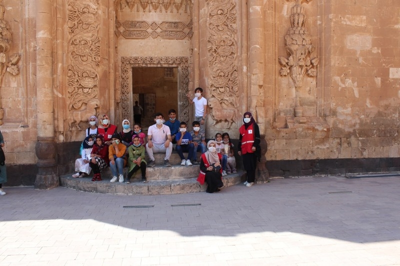 Bu çerçevede köylere giderek 25 çocuğu araçlarla ilçe merkezine getiren Türk Kızılay gönüllüleri, onlarla Osmanlı Devleti'nin Anadolu'daki seçkin eserlerinden İshak Paşa Sarayı'nı gezdi.