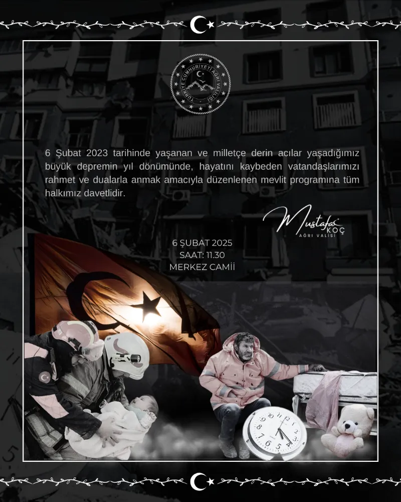 6 Şubat 2023'te "asrın felaketi" olarak nitelenen Kahramanmaraş merkezli 11 ili etkileyen deprem nedeniyle hayatını kaybedenler anısına Mevlid-i Şerif okutulacak. Ağrı Valisi Mustafa Koç 06 Şubat 2025 saat 11.30 da Ağrı Merkez camiinde okutulacak Mevlid programına tüm halkımızın davetli olduğunu bildirdi.