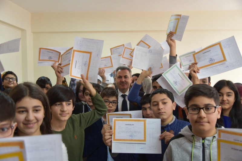 Öğrencilerle teker teker ilgilenen Vali Elban, öğrencilerdeki karne sevinci ve heyecanlarına ortak oldu.
