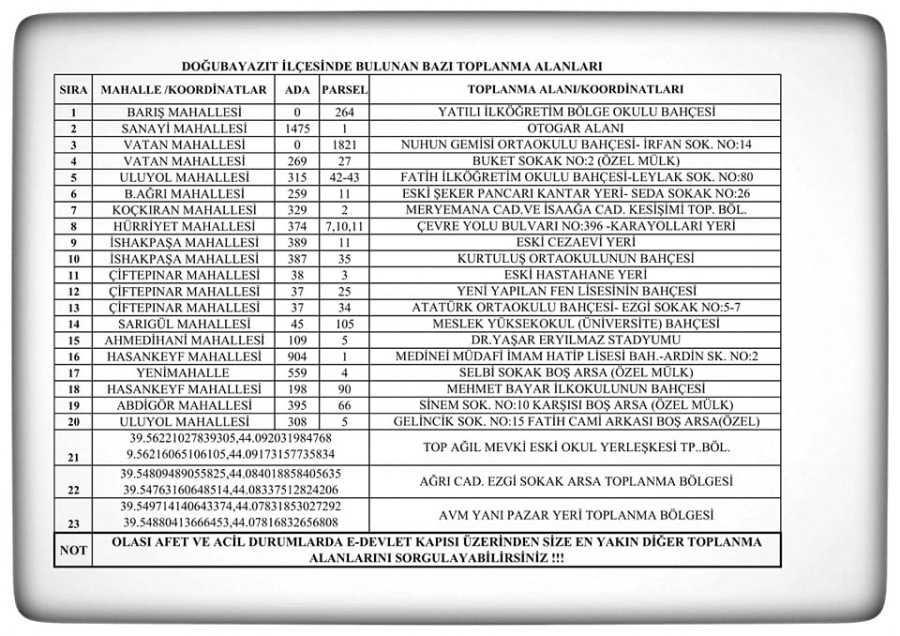 Doğubayazıt Belediyesi Olası bir afet ve depremde toplanma alanlarını belirledi.Belediye kültür ve sosyal işler müdürlüğü tarafından hazırlanan, Olası bir afet durumunda, İlçemizde ki toplanma alanları listesi görseli: