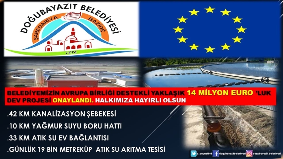 Doğubayazıt Belediyesinin şimdiye kadar en büyük projeleri arasında olan Avrupa birliği destekli, kanalizasyon, yağmur suyu ve atık su arıtma tesisinin olduğu yaklaşık 13.5 Milyon Euro‘luk dev bütçe, Belediye Başkanı Yıldız ACAR’ın girişimleri sonucu onaylandı.