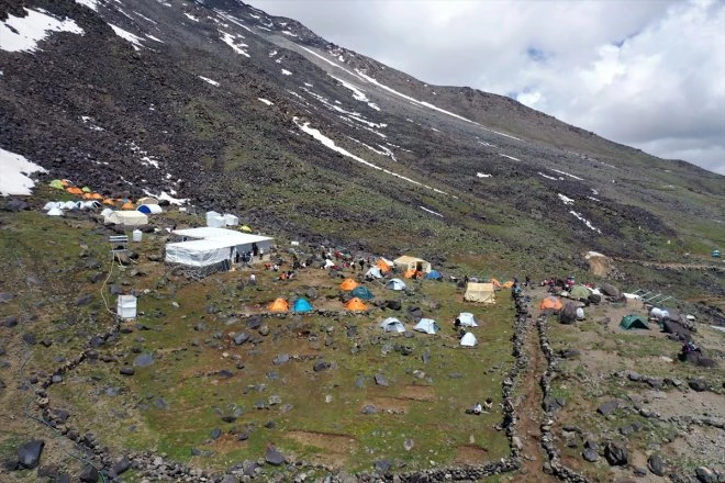 İlçeye gelen yerli ve yabancı turistler ile doğa tutkunları, saatlerce süren yürüyüşün ardından ilk kamp alanı olan 3 bin 200 rakıma ulaşıyor.