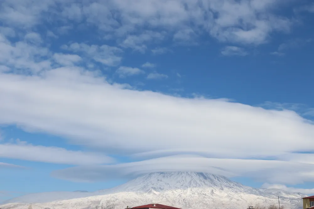 Doğubayazıt ilçesinde bulunan Ağrı Dağı'nın üst kısımlarını kaplayan şapka şeklinde mercek bulutu oluştu.