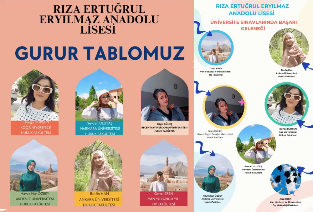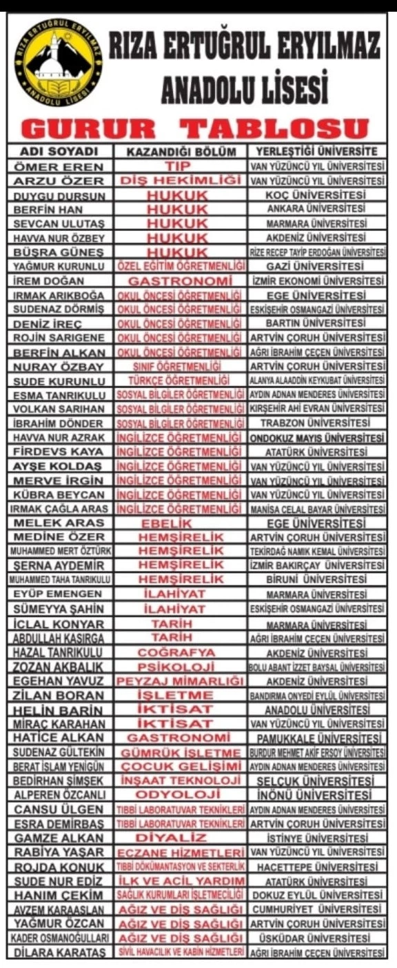 "Okulumuz Rıza Ertuğrul Eryılmaz Anadolu Lisesi 2023-2024 Eğitim Öğretim sezonunda 130 öğrencinin uzun soluklu YKS maratonunda, tüm öğretmen arkadaşlarım ve idare ekibimizle yaptığımız rehberlik çalışmaları neticesinde öğrencilerimizin azim ve gayreti ile değerli velilerimizin de gayret ve çabaları bir araya gelince, neticesi 60 öğrencimiz çok kalifiye bölümler kazanarak gelecekte vatanına ve milletine hizmet edebilecek şansı yakalamış oldular.