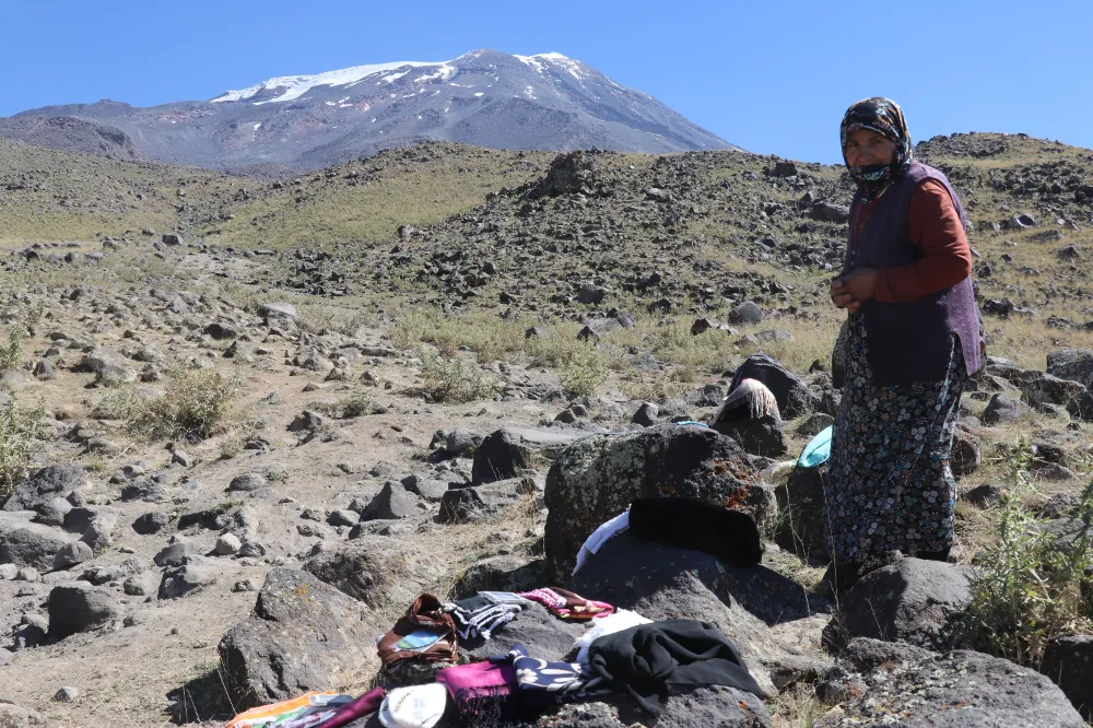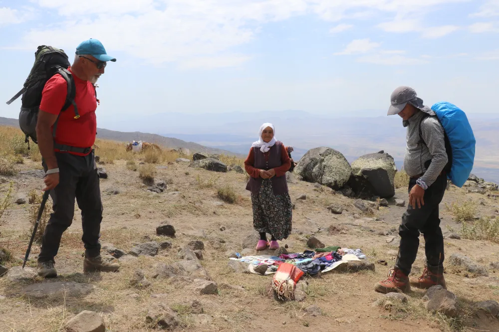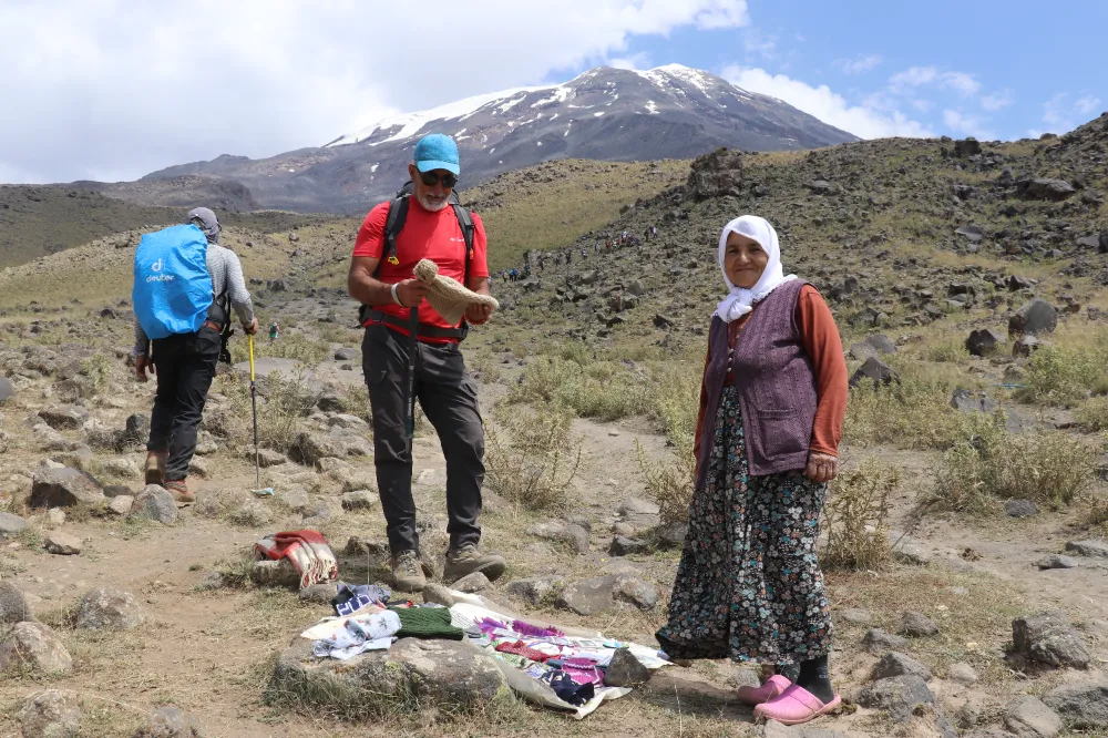 Yürüyüş güzergahında sıcak havaya rağmen hemen hemen her gün saatlerce dağcıların gelişini bekleyen Turan, turist kafilesine ürünlerini pazarlayıp kazanç sağlıyor.