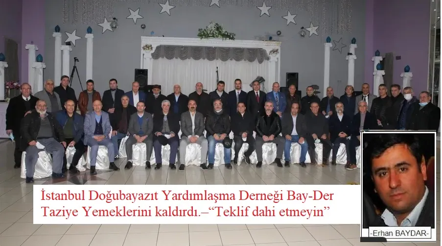 Bilindiği gibi, iki yıl önce şikayet ve yakınmalar üzerine İstanbul Doğubayazıt Sosyal Yardımlaşma Derneği Bay-Der aldığı kararla taziye yemeklerini tamamen kaldırmış ve sadece çorba ikramı ile örnek uygulamaya ön ayak olmuştu.