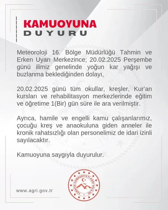 20 Şubat 2025 Perşembe günü ilimiz genelinde tüm okullar, kreşler, Kur’an kursları ve rehabilitasyon merkezlerinde eğitime 1 (bir) gün ara veriyoruz.