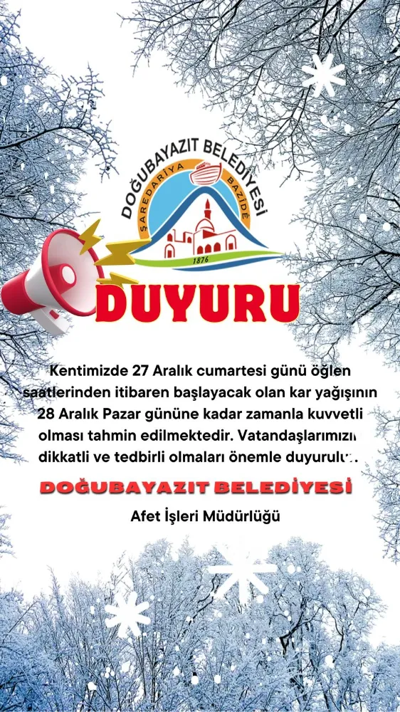 Doğubayazıt Belediyesi Afet İşleri Müdürlüğü kuvvetli kar yağışı uyarısında bulunarak dikkatli olunmasını istedi. Kar yağışının 27 Aralık 2025 Cumartesi öğlen saatlerinden itibaren başlayıp 28 Aralık 2025 Pazar gününe kadar zaman zaman kuvvetli olmasına dikkat çekildi.