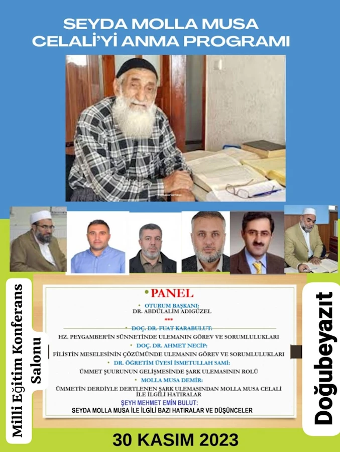 Ömrünü ilme ve İslâm'a vakfeden, insanlığa faydalı olmak adına yetiştirdiği öğrenciler ve ortaya koyduğu eserlerle, topluma ruh ve canlılık katan büyük Alim Seyda Molla Musa Celali Hocamız ölüm yıl dönümünde Ağrı ve Doğubayazıt’ta düzenlenecek panelle anılacak.